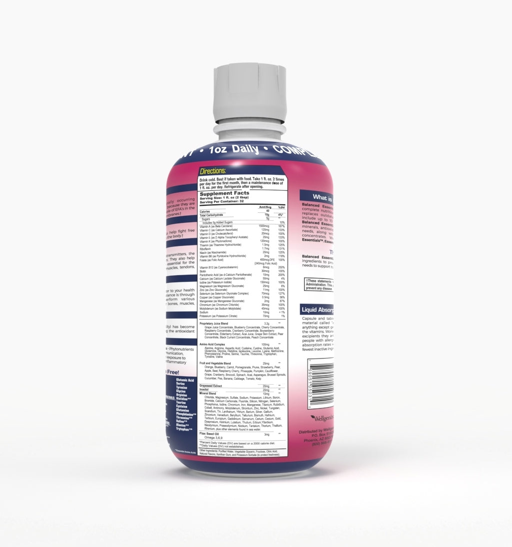 Balanced Essentials delivers a broad variety of vitamins, minerals, amino acids, omegas, and a fruit & vegetable blend in a smooth liquid format designed for everyday use. Each one-ounce serving provides a diverse range of nutrients in an easy-to-take liquid that fits naturally into your daily routine.