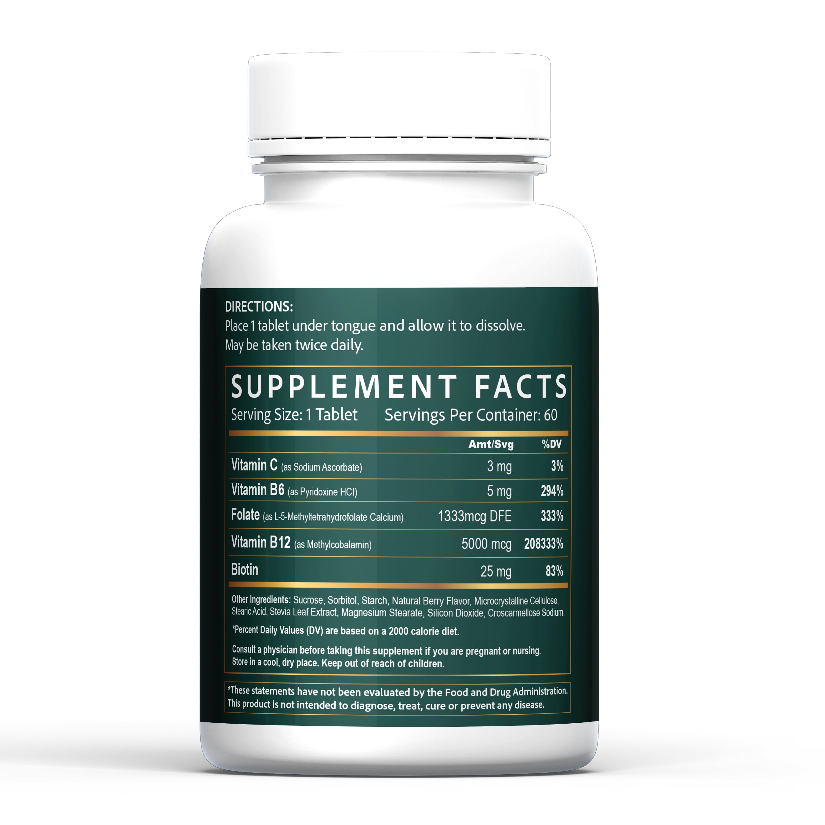 BioAvailable B12 Max 5000mcg provides a simple, fast-dissolve format for individuals who prefer B-12 tablets that melt in the mouth rather than traditional capsules. Each tablet features methylcobalamin a widely used, active form of Vitamin B-12 combined with B6 and methyl folate in a convenient daily routine.