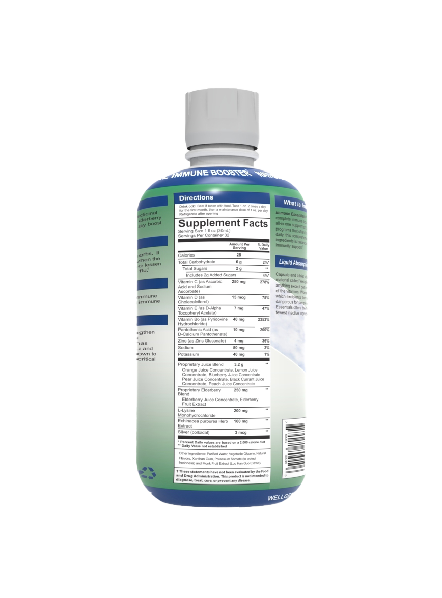 Immune Essentials is a convenient liquid immune support supplement for adults and teens ages 16+. Each one-ounce serving delivers a broad blend of vitamins, minerals, herbal extracts, and botanical nutrients in an easy-to-take format that can be used on its own or mixed with your favorite beverage.