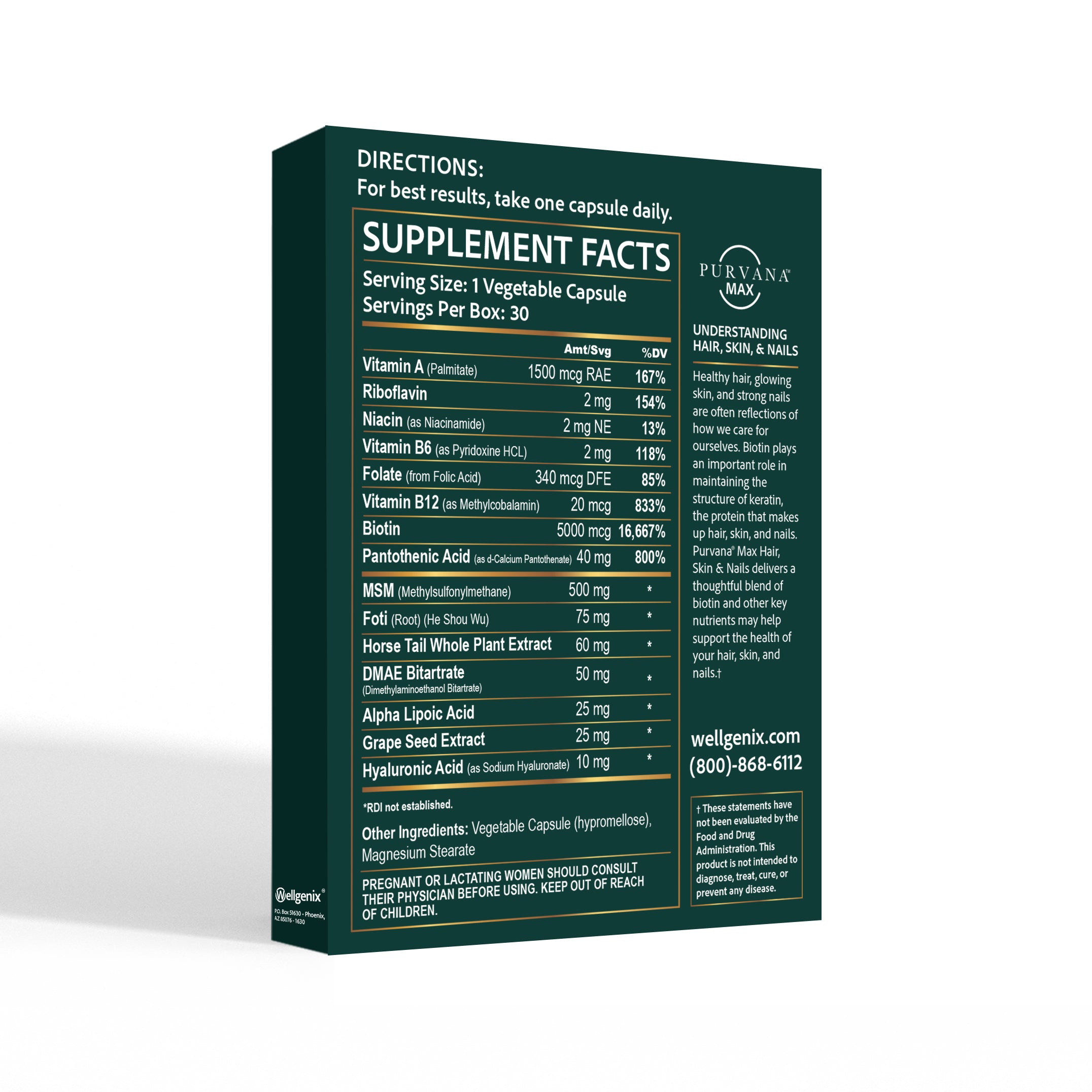 Purvana Max 30ct is a once-daily vegetable capsule featuring a concentrated blend of biotin, MSM, horsetail extract, Fo-Ti root, DMAE, and grape seed extract—ingredients commonly used in beauty-focused wellness routines. This clean, simple formula offers an easy way to incorporate beauty-related nutrients into your daily habits.